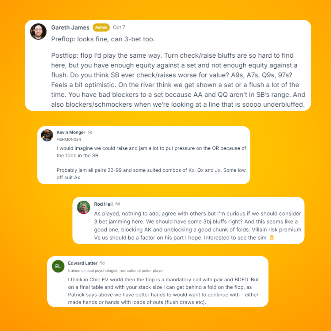 Use our private community to post hands, ask questions and receive high-quality feedback from me and the other members that: